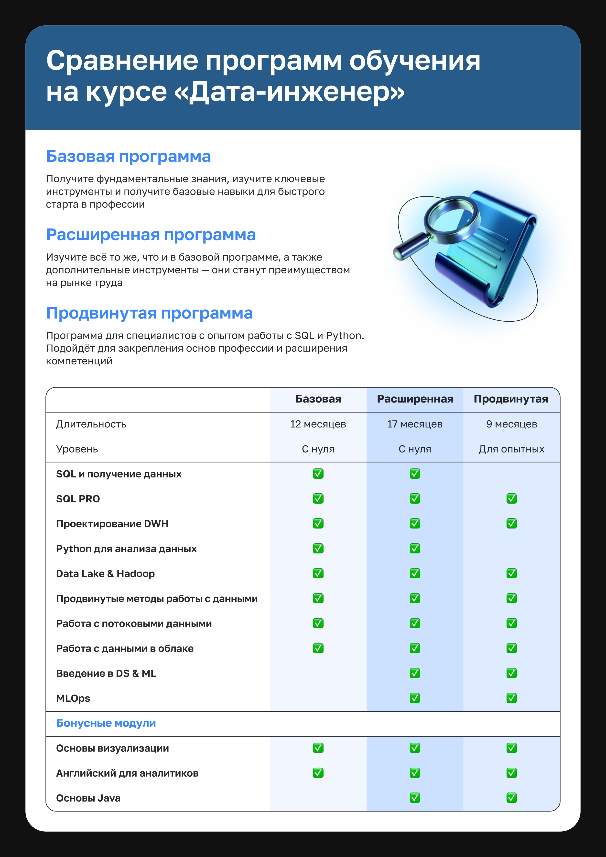 Сможете выбрать подходящую программу: базовую или расширенную для новичков, продвинутую для специалистов с опытом в SQL и Python