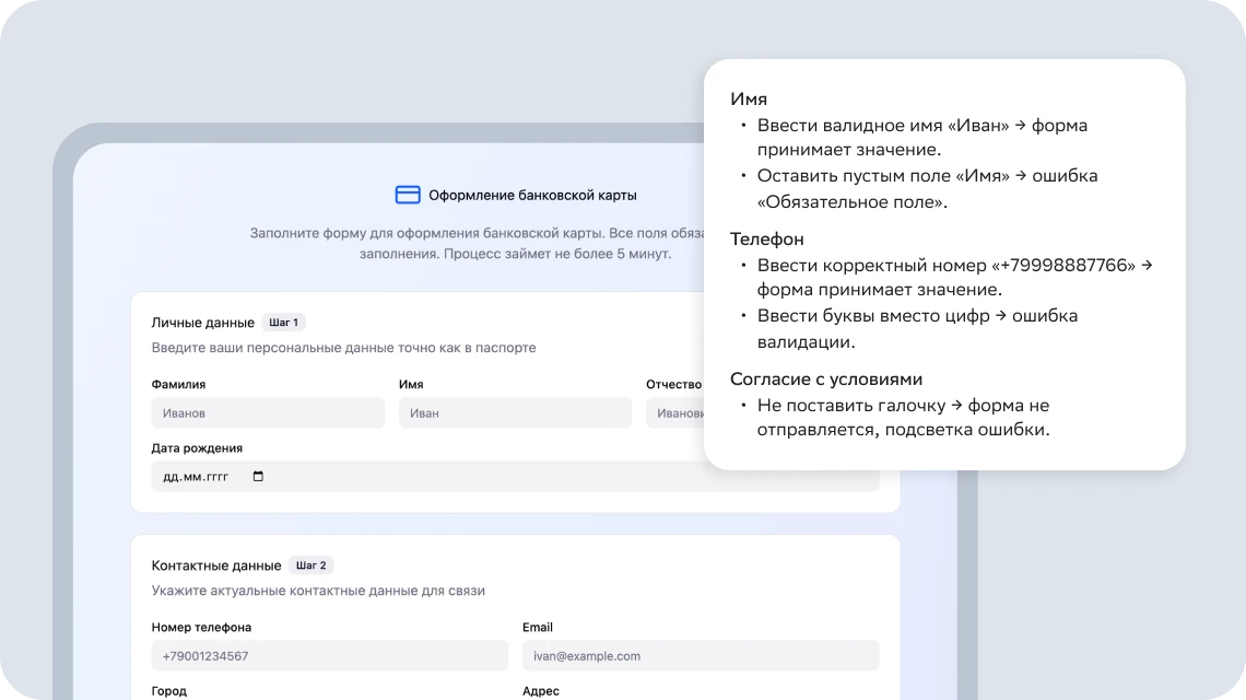 Проверите веб-форму оформления банковской карты: составите тест-кейсы для проверки полей имени, телефона и согласия с условиями
