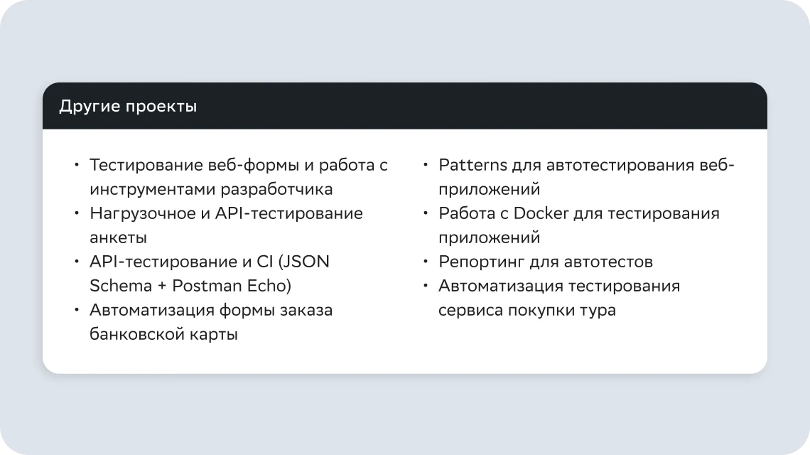 Вы изучите самые популярные инструменты тестирования, в том числе языки программирования Java, JavaScript, Python, а также Linux, Android Studio, Espresso, JUnit, Selenium, Selenide, DevTools, Postman, Puppeeter, Playwright, Cypress, Docker и Docker Compose, Jenkins, Teamcity и GitLab CI.